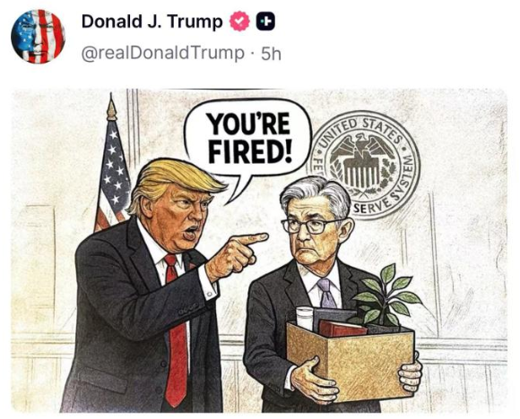 据美国消费者新闻与商业频道(CNBC)报道中国星配资,当地时间27日,美国总统特朗普在社交媒体平台发布了一张卡通图片,画面显示,他正在解雇美联储主席杰罗姆・鲍威尔。
