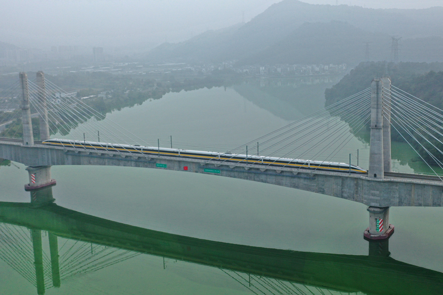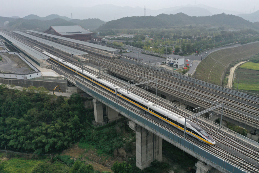 检测列车行驶在杭衢高铁新安江特大桥(资料照片) 图片来源:新华社