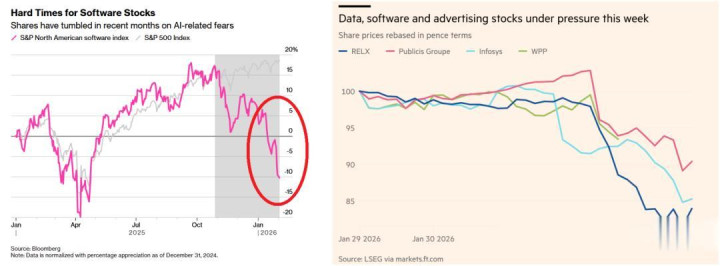 英国原本被视为AI赢家的Relx(拥有LexisNexis)重挫14.4%,伦敦证交所集团(LSEG)下跌 12.8%,创五年最差单日表现。广告巨头WPP和Omnicom也因担心营销工作被自动化而大跌。