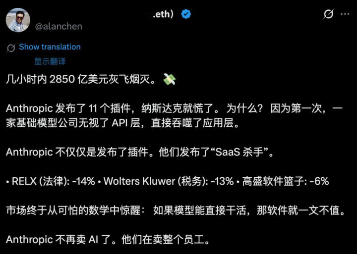 起因竟是,Anthropic为Claude Cowork植入「插件」(plugins)功能。仅凭一己之力,凌迟老牌巨头公司。