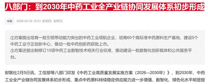 最近,中药行业迎来一个重磅文件。工信部等八部门联合发文,力推中药工业高质量发展,目标直指2030年形成全产业链体系。